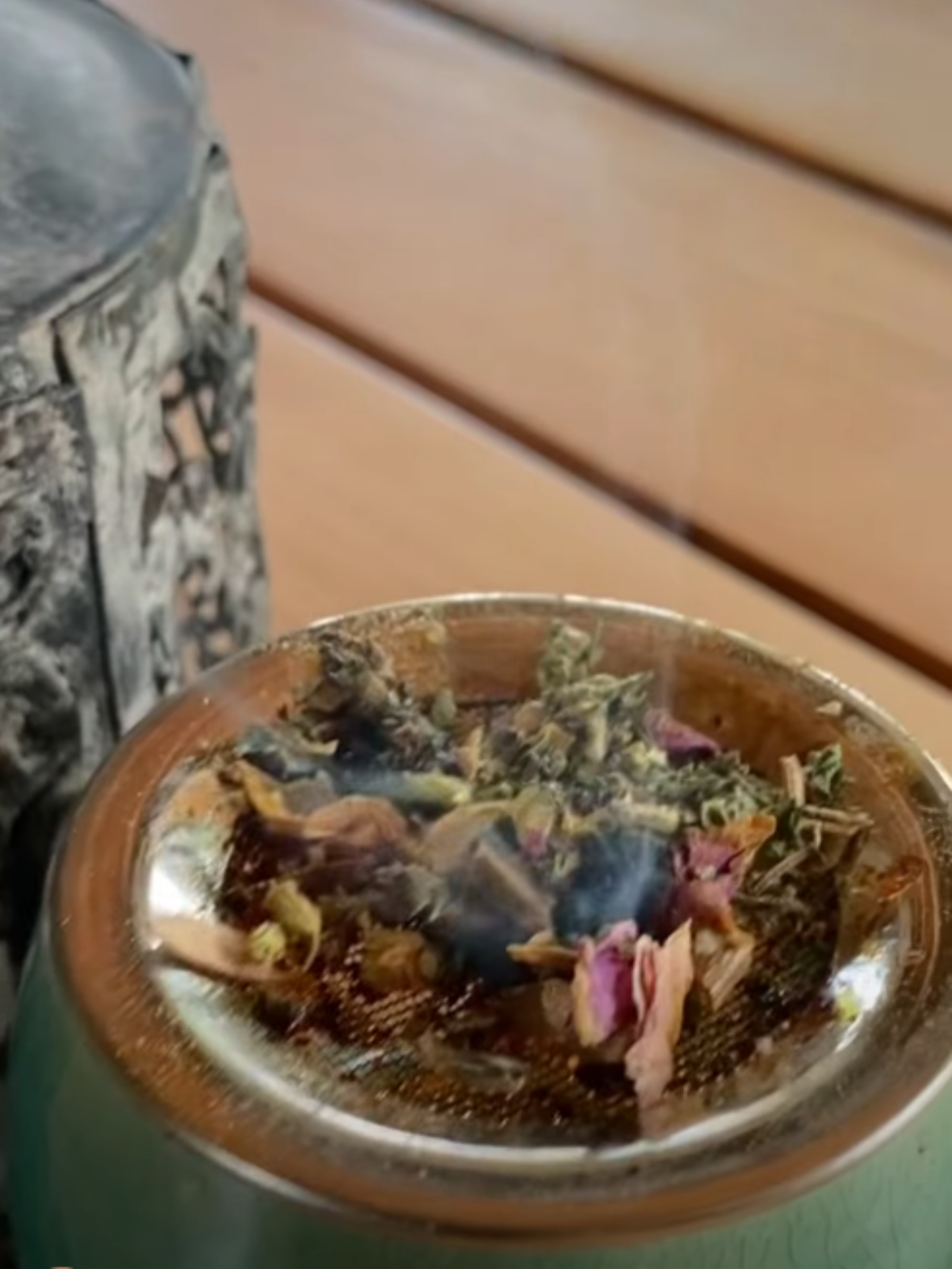 Ако искаш билките да горят и димят силно с помощта на канелената пръчица ги разположи към центъра на ситото – така ще има истински опушващ ефект. За пренасяне и окадяване на пространство използвай чинийката.