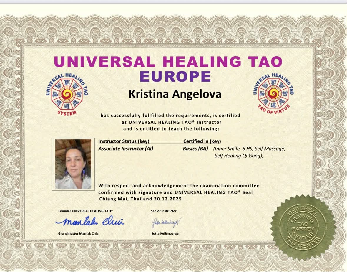 Обучавах се в системата на „Универсално лечебно Дао“ на Мантак Чиа и съм асоцииран инструктор към UHT - Grandmaster Mantak Chia.